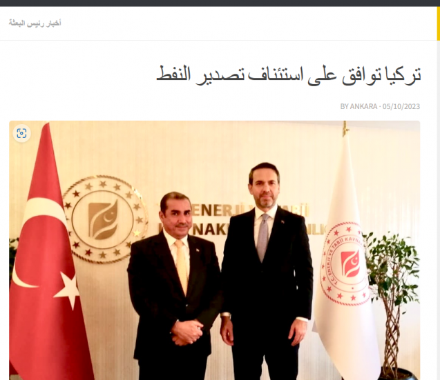 واشار رئيس مجلس الوزراء ، بحسب بيان لمكتبه الاعلامي ، الى :" ان الحكومة تبذل جهوداً كبيرة لغرض استئناف تصدير النفط من اقليم كردستان العراق"، مبيناً :" ان المفاوضات مستمرة مع شركات النفط الاجنبية المتعاقدة مع الاقليم لغرض حسم بعض المشاكل الفنية لاستئناف التصدير ".