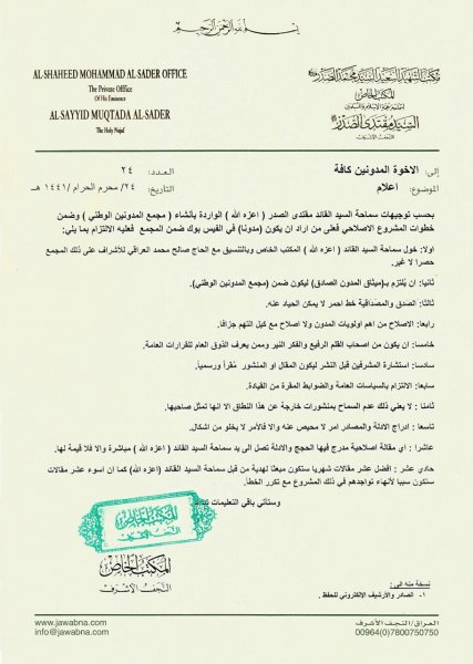 وجاء في التوجيهات التي نشرها مكتب الصدر الخاص، إنه "بحسب توجيهات السيد الصدر الواردة بانشاء مجمع المدونين الوطني، وضمن خطوات المشروع الاصلاحي، فأنه على من اراد أن يكون مدونا في فيسبوك ضمن المجمع فعليه الالتزام بـ 11 شرطا .