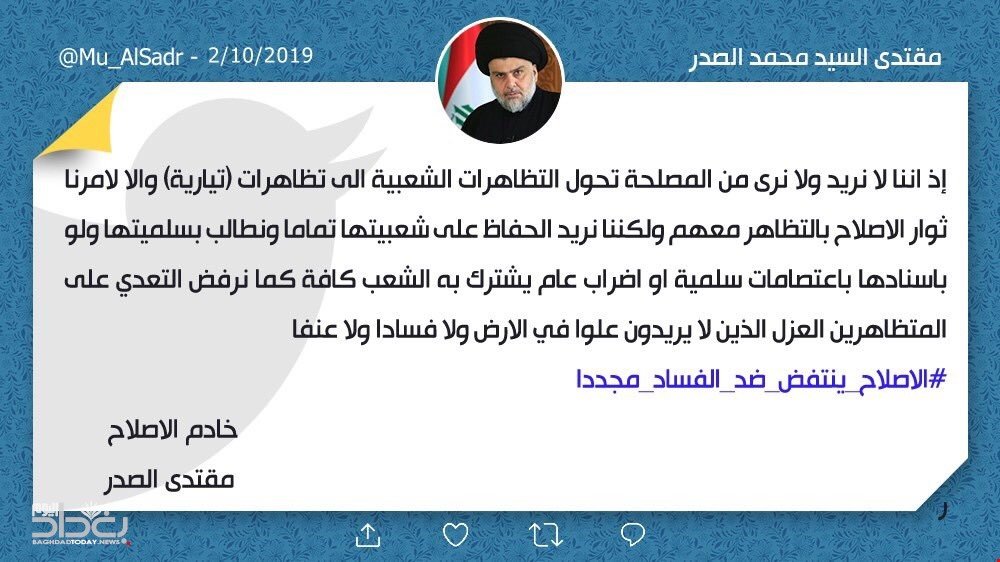 وطالب الصدر، بـ "سلمية التظاهرات ولو بإسنادها باعتصامات سلمية أو اضراب عام يشترك به الشعب كافة"، مؤكدا "رفضه التعدي على المتظاهرين العزل الذين لا يريدون علوا في الأرض ولا فسادا ولا عنفا".