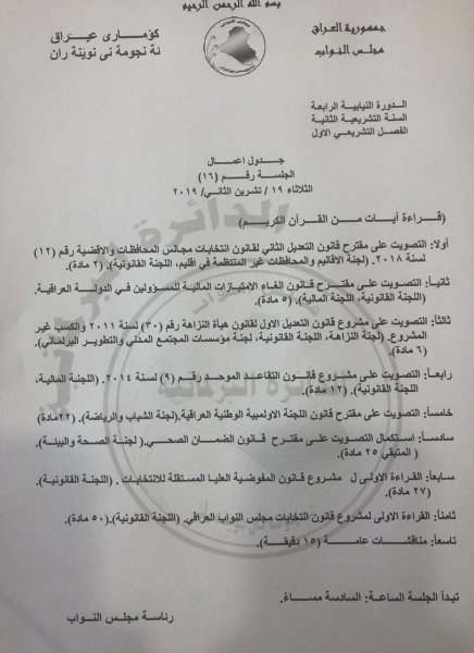 وبحسب الوثيقة ادناه فأن "الجدول يتضمن التصويت على ستة مشاريع قوانين والقراءاة الاولى لمشروعي قانونين".