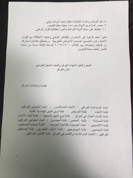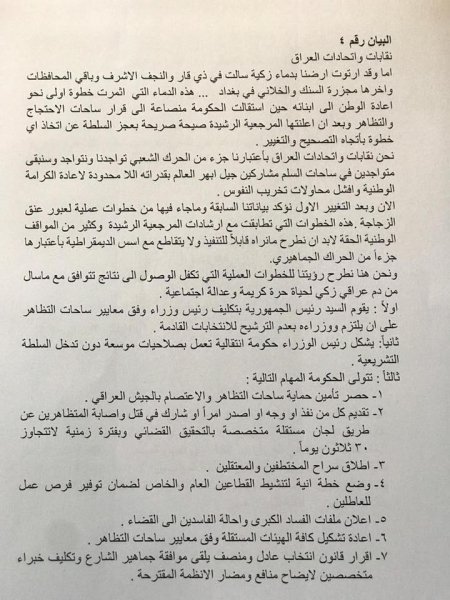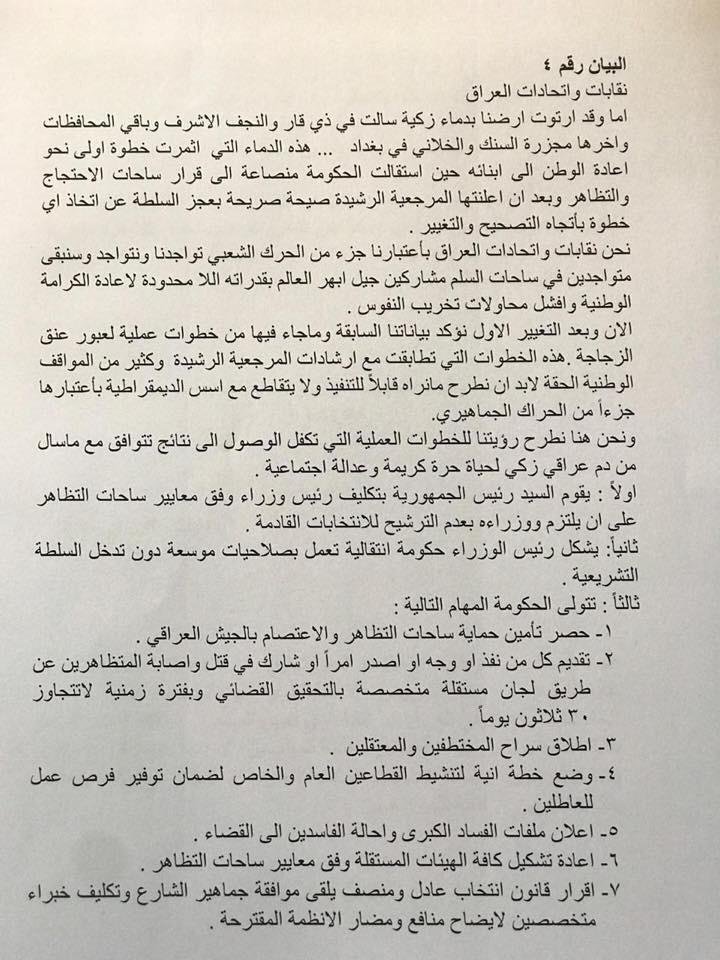 تنشر وكالة من كربلاء الخبر وثائق لنقابات واتحادات العراق تتضمن طرح رؤيتها للوضع في البلاد منها كيفية اختيار رئيس الوزراء.