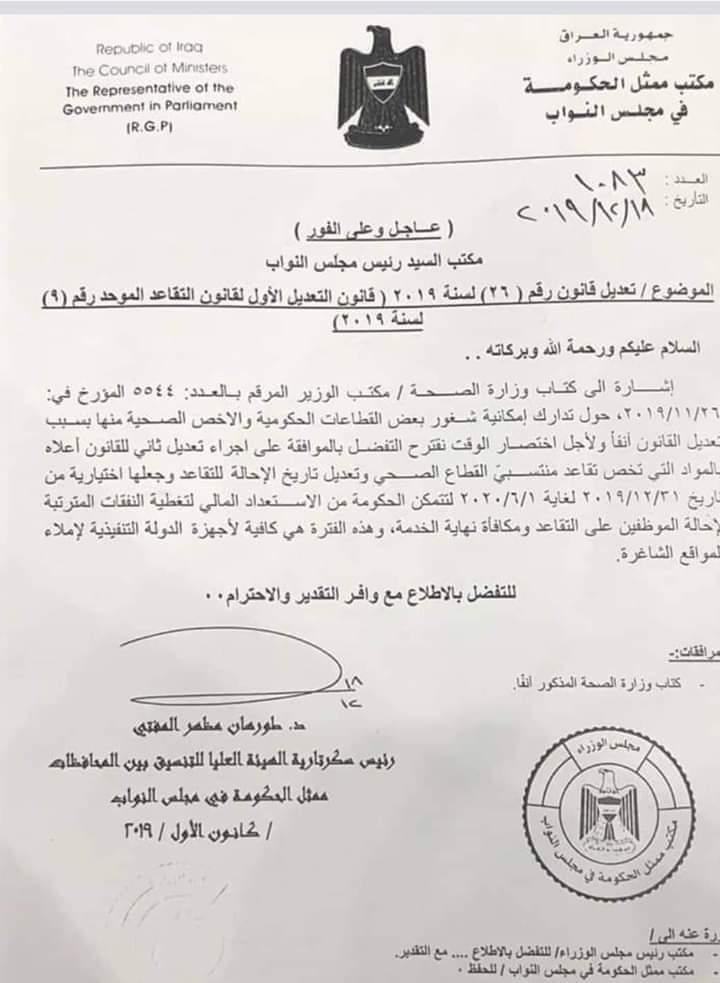 تنشر وكالة من كربلاء الخبر ، وثيقة تتضمن طلب استثناء من قانون التقاعد، لمنتسبي القطاع الصحي.