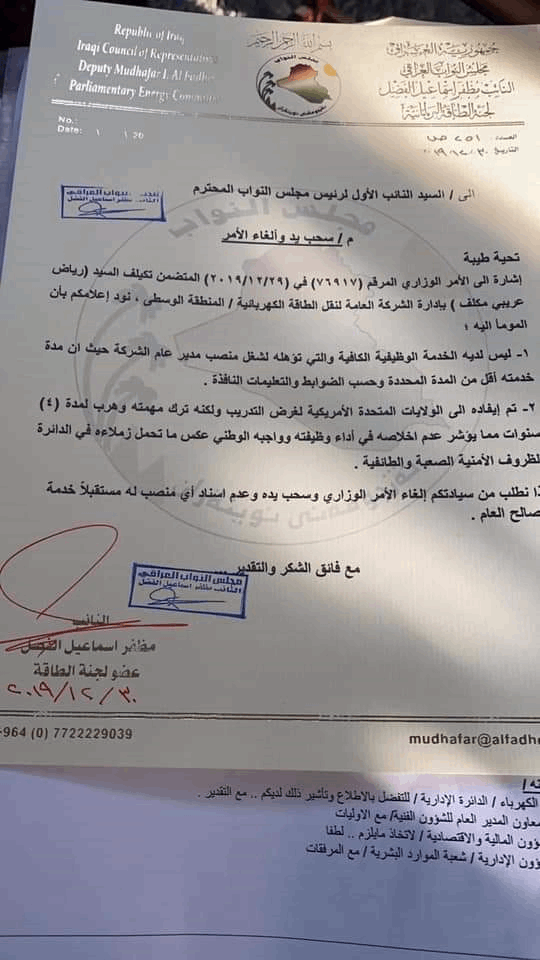 طالب النائب الأول لرئيس مجلس النواب حسن الكعبي، وزارة الكهرباء، بإلغاء الأمر الوزاري المتضمن تكليف "رياض عريبي مكلف" بإدارة الشركة العامة لنقل الطاقة الكهربائية / المنطقة الوسطى، داعياً إلى عدم إسناد أي منصب له مؤخراً.