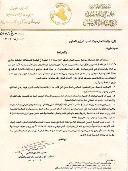 وتتضمن الوثيقة، الاستفسار عن اجراءات الوزارة بشأن الاحداث الاخيرة منها القصف الاميركي قرب مطار بغداد.