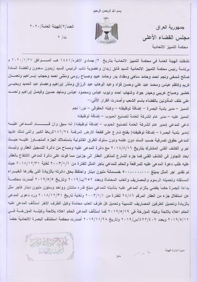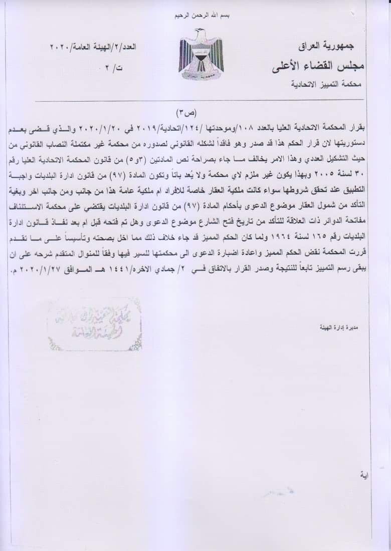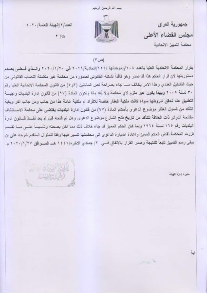وقال القضاء الاعلى في بيان ان "الهيئة العامة لمحكمة التمييز الاتحادية أصدرت في جلستها المنعقدة بتاريخ 27 /1 / 2020 قرارا بالاتفاق بان مايصدر من المحكمة الاتحادية العليا وهي غير مكتملة النصاب القانوني بموجب احكام المادتين 3 و5 من قانون المحكمة رقم 30 لسنة 2005 لايعتد به وغير ملزم".