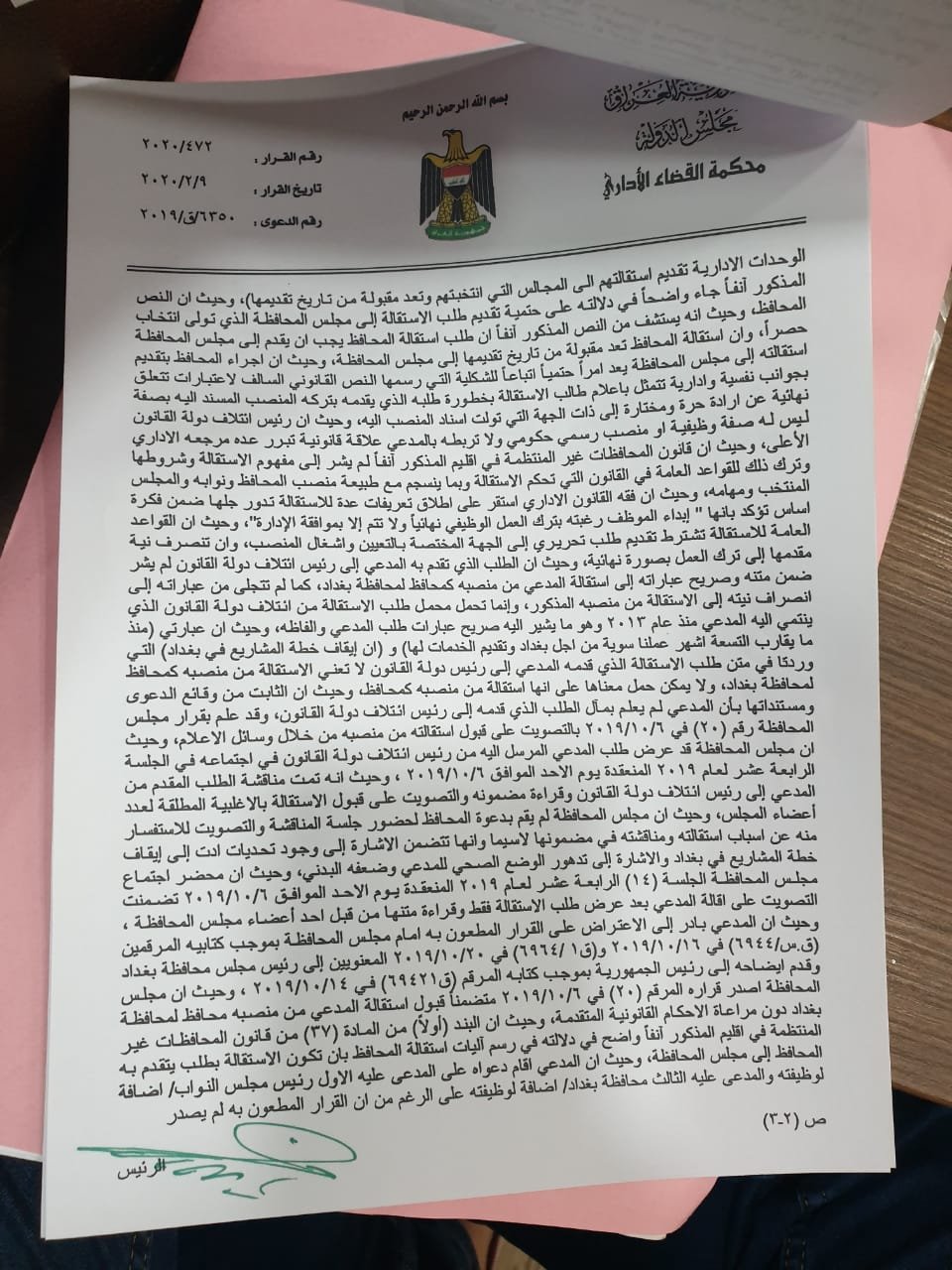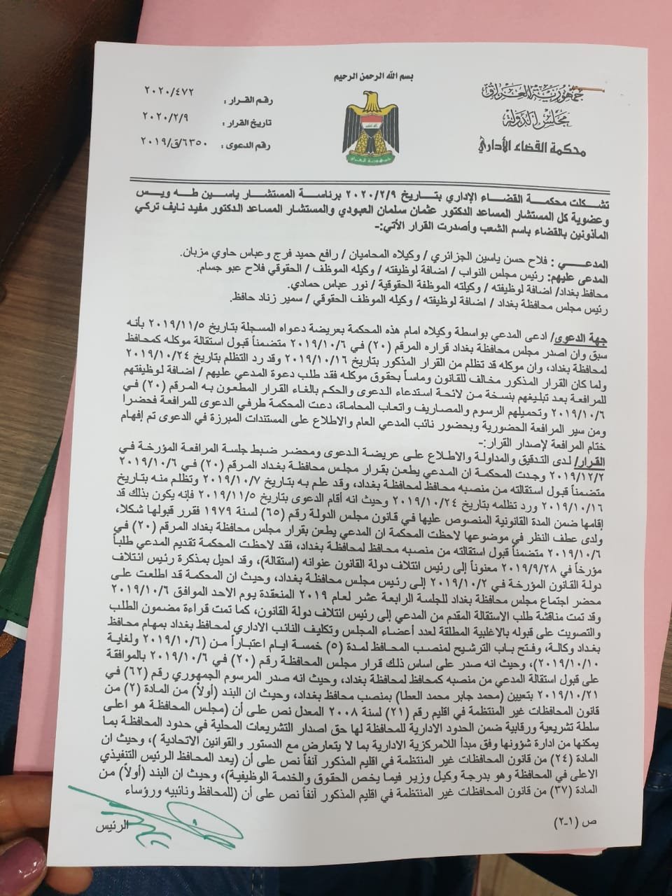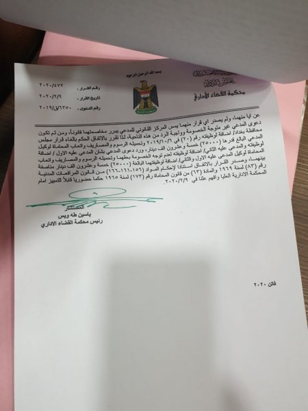 وبحسب الوثائق ادناه فأن "المحكمة اعتبرت ان تصويت مجلس محافظة بغداد على استقالة المحافظ فلاح الجزائري غير قانونية".