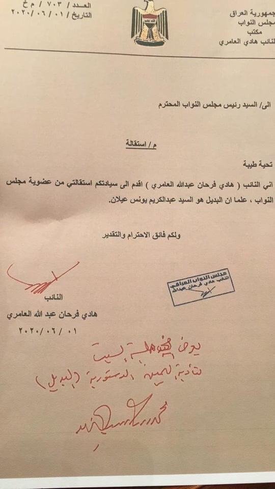 تنشر وكالة من كربلاء الخبر ، بالوثيقة تقديم رئيس تحالف الفتح هادي العامري استقالته من عضوية مجلس النواب، وترشيح عبد الكريم يونس بدلاً عنه.