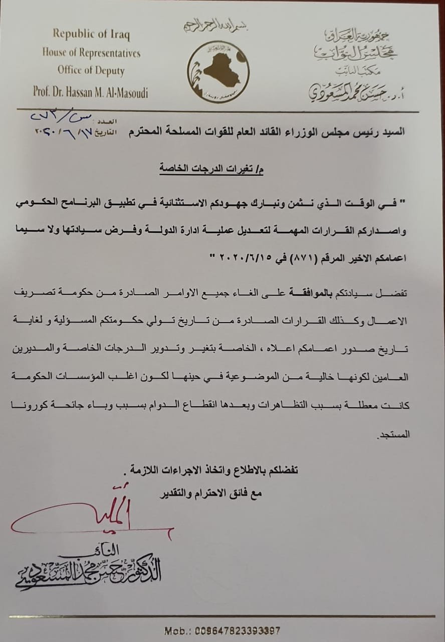 تنشر وكالة من كربلاء الخبر وثيقة موقعة باسم النائب حسن المسعودي يطلب من رئيس الوزراء مصطفى الكاظمي الغاء الاوامر الصادرة من حكومة تصريف الاعمال السابقة بشأن تغيير الدرجات الخاصة.