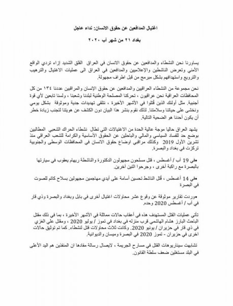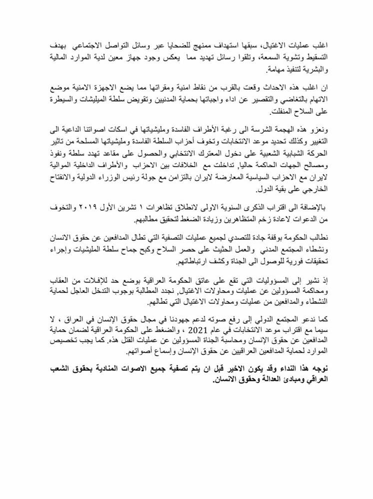 وطالب الناشطون الذي لم يكشفوا عن اسمائهم، الحكومة بالتصدي لجميع عمليات التصفية التي تطال المدافعين عن حقوق الانسان، ونشطاء المجتمع المدني، إضافة إلى دعوتهم المجتمع الدولي إلى دعم جهود المدافعين عن حقوق الانسان في العراق.