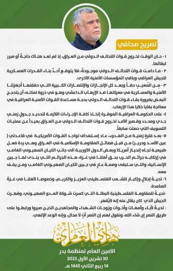 العامري: استهداف القوات الامريكية ردة فعل طبيعية وحان الوقت لخروجها من العراق
