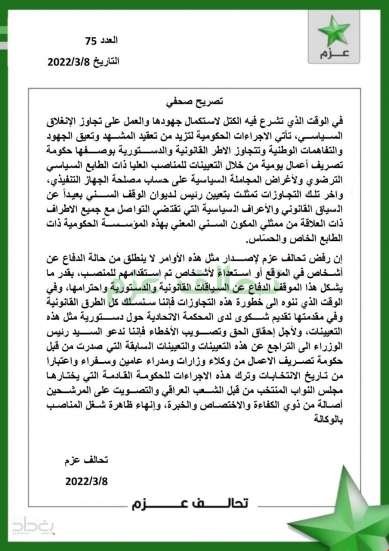 تحالف عزم يصدر بياناً بشأن تعيينات للمناصب العليا في حكومة تصريف الأعمال: "مجاملة سياسية