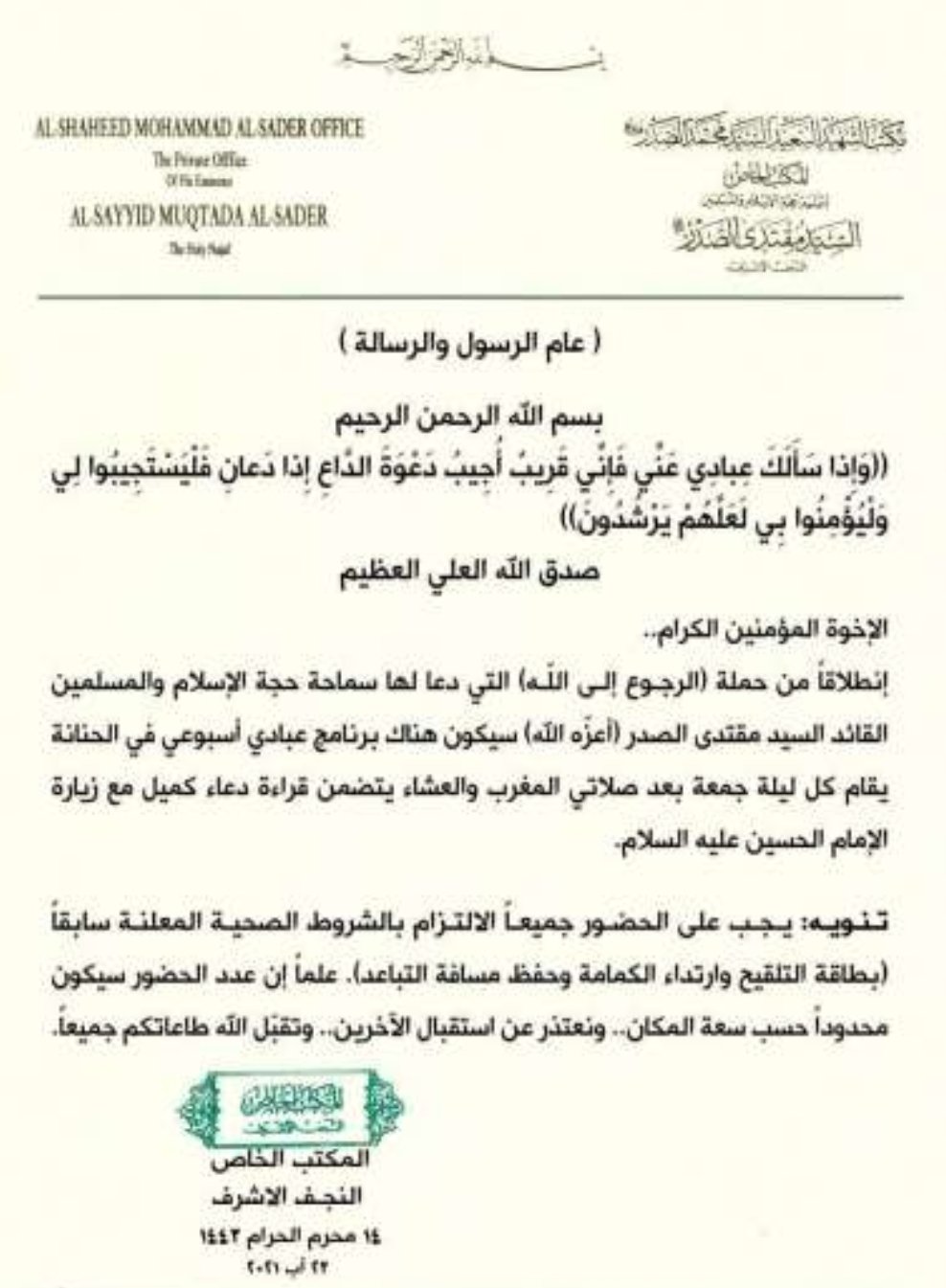 مكتب الصدر الخاص يعلن برنامجاً جديداً في الحنانة (وثيقة)