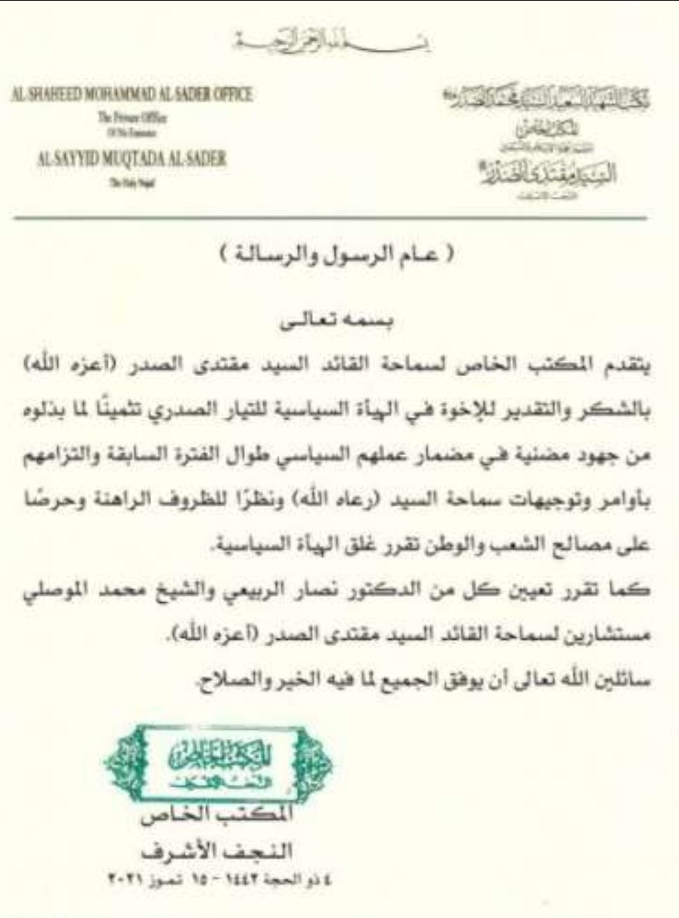 عقب الانسحاب من الانتخابات.. قرار آخر من الصدر للهيئة السياسية للتيار (وثيقة)