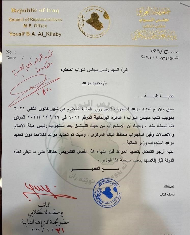 النائب الثاني للحلبوسي يحدد موعد استجواب وزير المالية علي علاوي