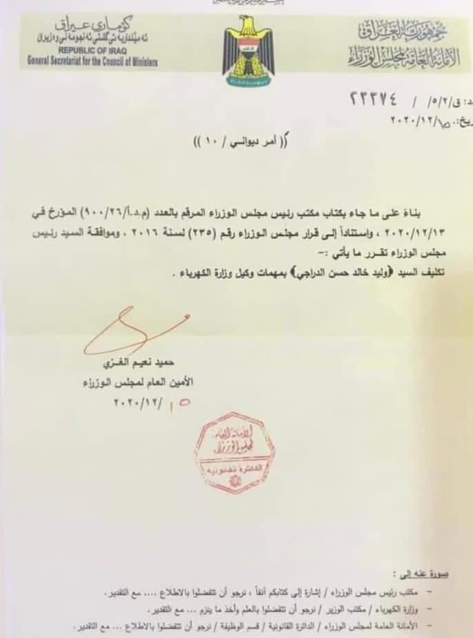 الكاظمي يكلف الدراجي وكيلا لوزارة الكهرباء