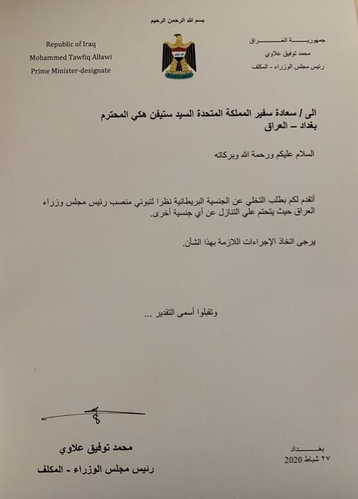 بالوثيقة.. محمد علاوي يقدم طلباً للسفير البريطاني من أجل التخلي عن جنسيته