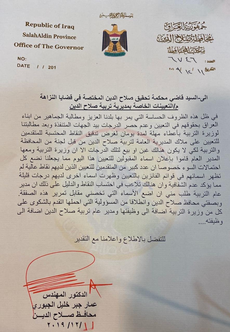 بالوثيقة.. محافظ صلاح الدين يرفع شكوى قضائية ضد وزيرة التربية ومدير تربية المحافظة
