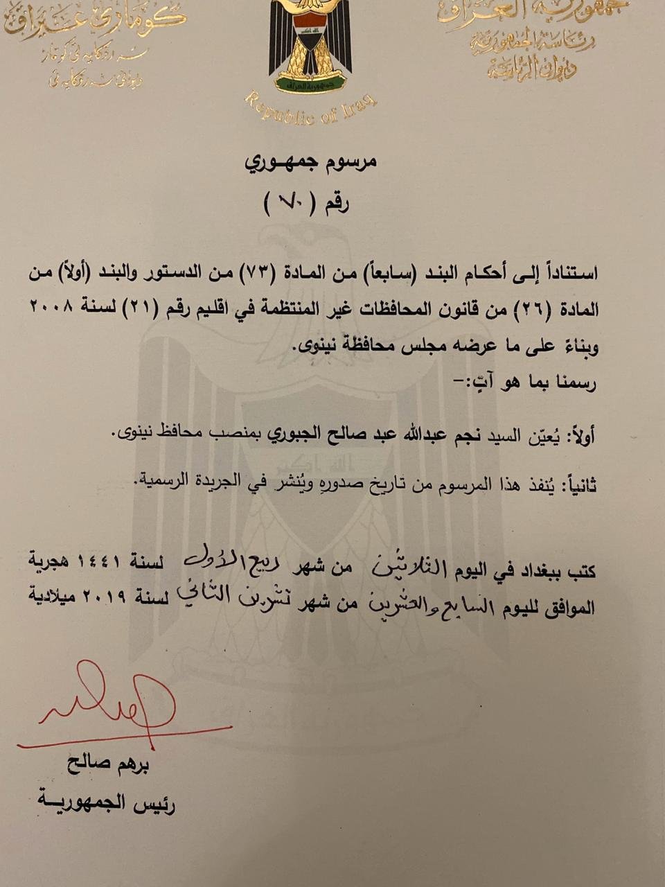 بالوثيقة.. برهم صالح يصادق على تعيين نجم الجبوري محافظا لنينوى