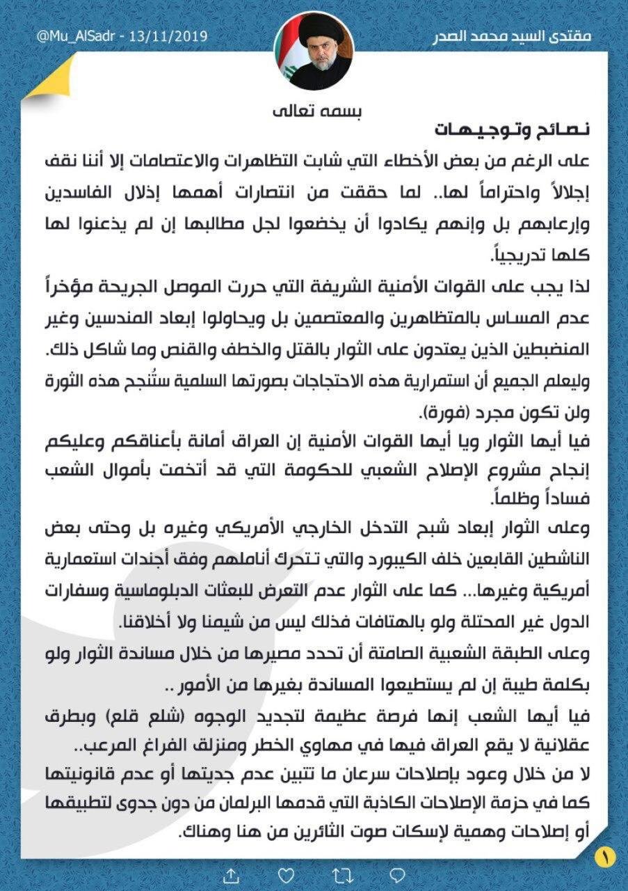 الصدر يصدر نصائح وتوجيهات بشأن التظاهرات