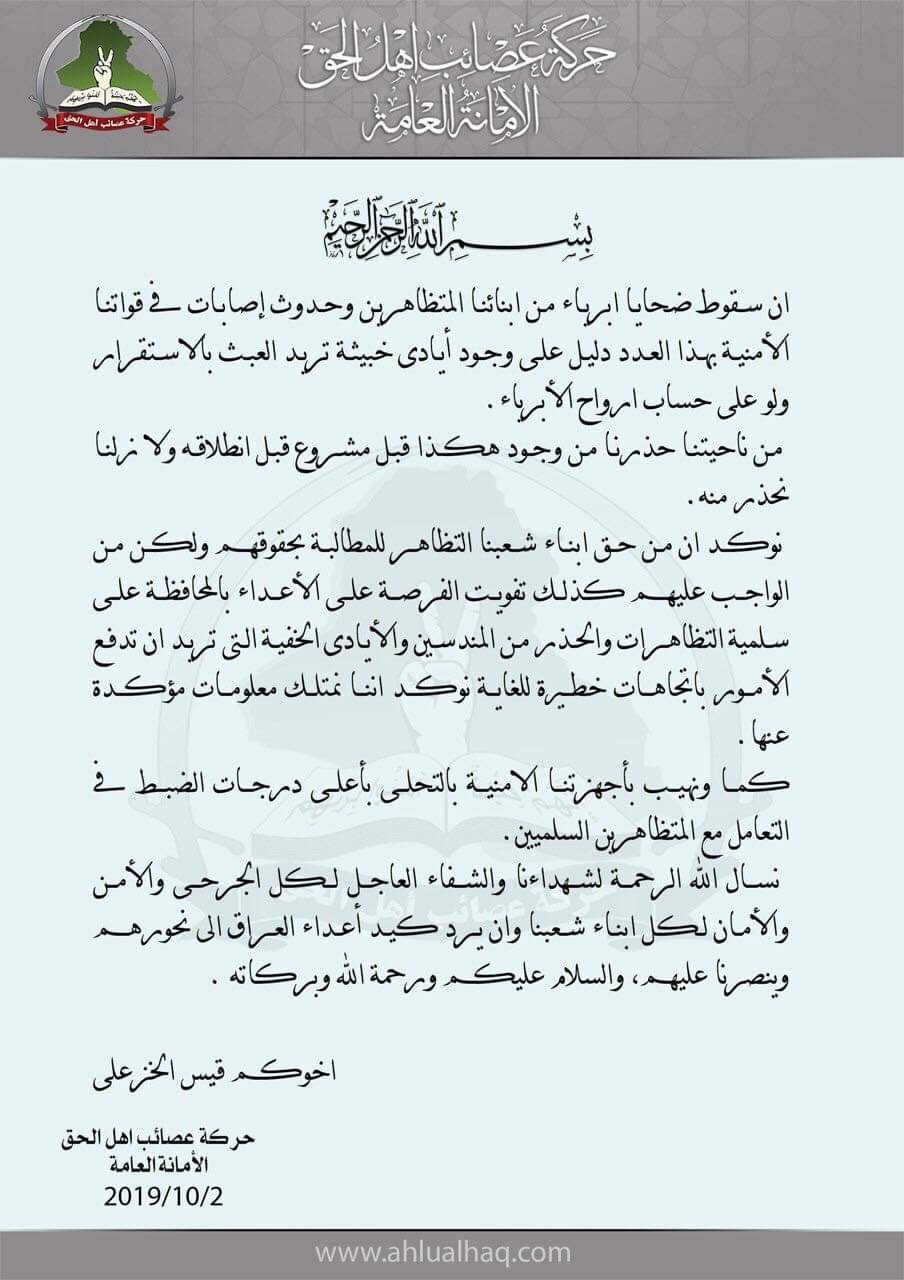 الخزعلي يعلق على التظاهرات التي شهدتها عدد من المحافظات