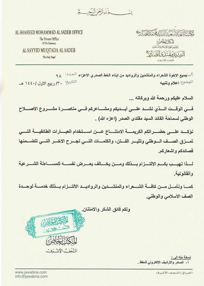 مكتب الصدر يوجه الشعراء والمنشدين بالابتعاد عن العبارات الطائفية