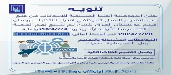 مفوضية الانتخابات تعلن فتح باب التقديم للعمل موظفي اقتراع لانتخابات برلمان اقليم كردستان