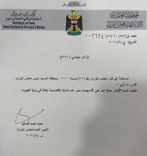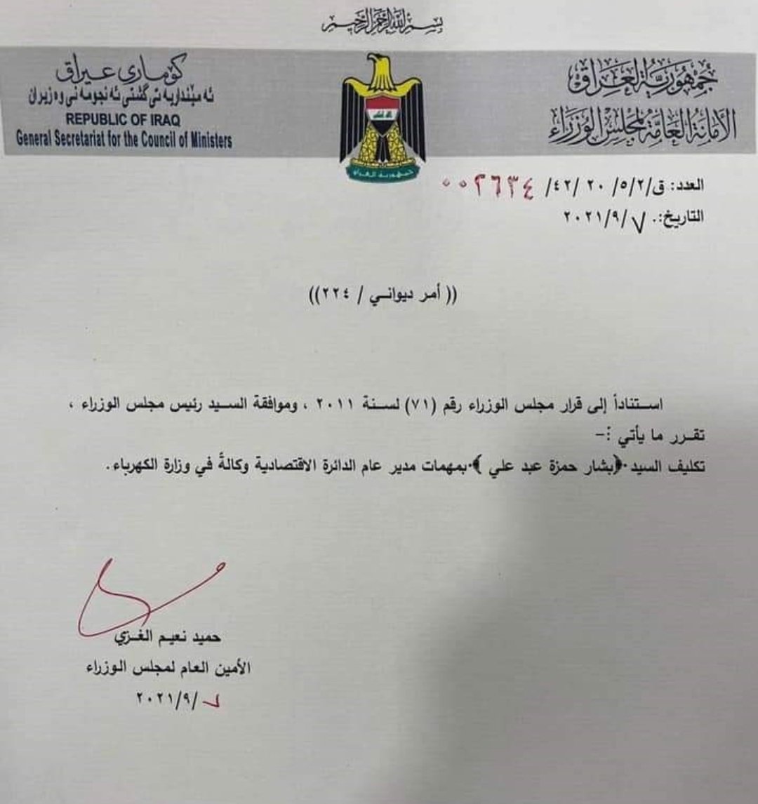 وتشير الوثيقة المذيلة بتوقيع الأمين العام لمجلس الوزراء الى انه "استنادا الى قرار مجلس الوزراء وموافقة رئيس مجلس الوزراء تقرر تكليف بشار حمزة بمهمات مدير عام الدائرة الاقتصادية في وزارة الكهرباء وكالة".![]()