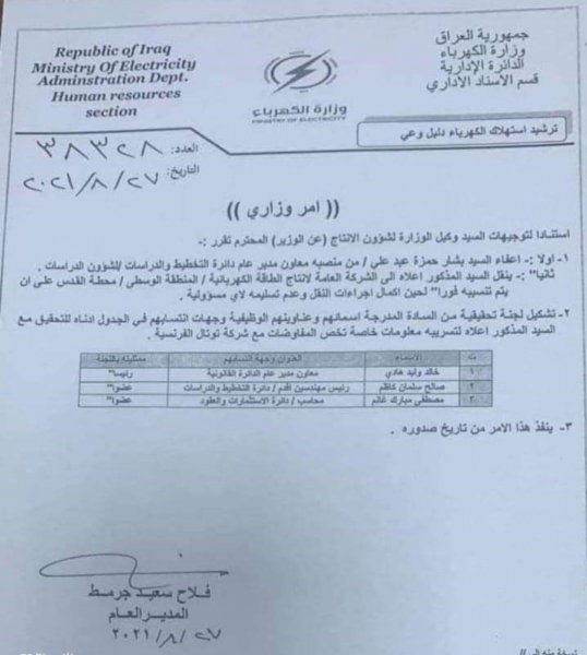 كشفت وثائق صادرة عن الأمانة العامة لمجلس الوزراء ووزارة الكهرباء، عن تعيين احد موظفي وزارة الكهرباء بدرجة مدير عام بعد 10 أيام من عقوبة صادرة بحقه وتشكيل مجلس تحقيق به لتسريبه معلومات تخص احد اهم عقود الوزارة.واظهرت وثيقة صادرة عن وزارة الكهرباء صادرة بتاريخ 27 اب الماضي حصل عليها صحفي ، "استنادا الى توجيهات وكيل الوزارة تقرر اعفاء بشار حمزة عبد من منصبة معاون مدير عام دائرة التخطيط في وزارة الكهرباء ونقله الى الشركة العامة الوسطى محطة القدس".وتنص الوثيقة انه "تنسيبه بشكل فوري لحين اكمال إجراءات النقل وعدم تسليمه لأي مسؤولية وتشكيل لجنة تحقيقية بحقه برئاسة مدير عام الدائرة القانونية في الوزارة لتسريبه معلومات هامة تخص المفاوضات مع شركة توتال الفرنسية".وبحسب وثيقة أخرى صادرة عن الأمانة العامة لمجلس الوزراء  "بتاريخ 7 من أيلول الجاري بعد 10 أيام من اقالته عين بشار حمزة بمنصب مدير عام في وزارة الكهرباء بناءً على موافقة خاصة من رئيس الوزراء".