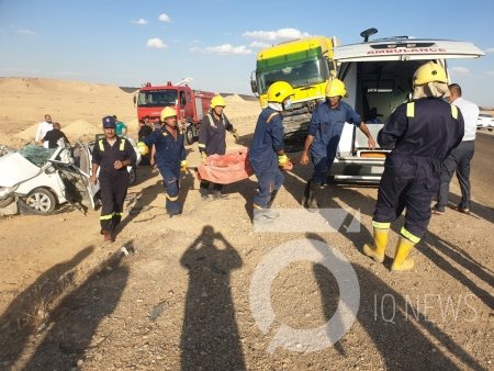 اتمت فرق انقاذ الدفاع المدني واجبها بانتشال ثمانية جثث من بينهم اطفال ونساء بعد حادث اصطدام مروع بين عجلتين الأولى نوع تويوتا صالون والثانية شاحنة نوع مرسيدس براد على الطريق الرابط بين قضاء هيت وقضاء حديثة في محافظه الأنبار غربي العراق .