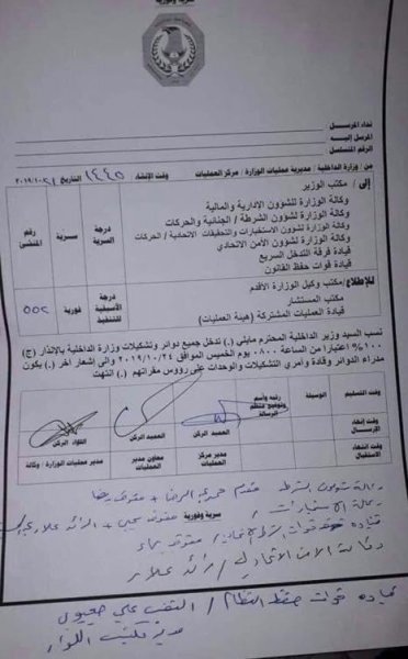 وتظهر الوثيقة توجيها من وزير الداخلية الى جميع مفاصل الوزارة بدخول حالة الانذار القصوى "ج" ١٠٠٪ اعتبارا من الساعة الثامنة من صباح يوم الخميس الموافق 24 تشرين الاول الحالي، وحتى اشعار اخر.