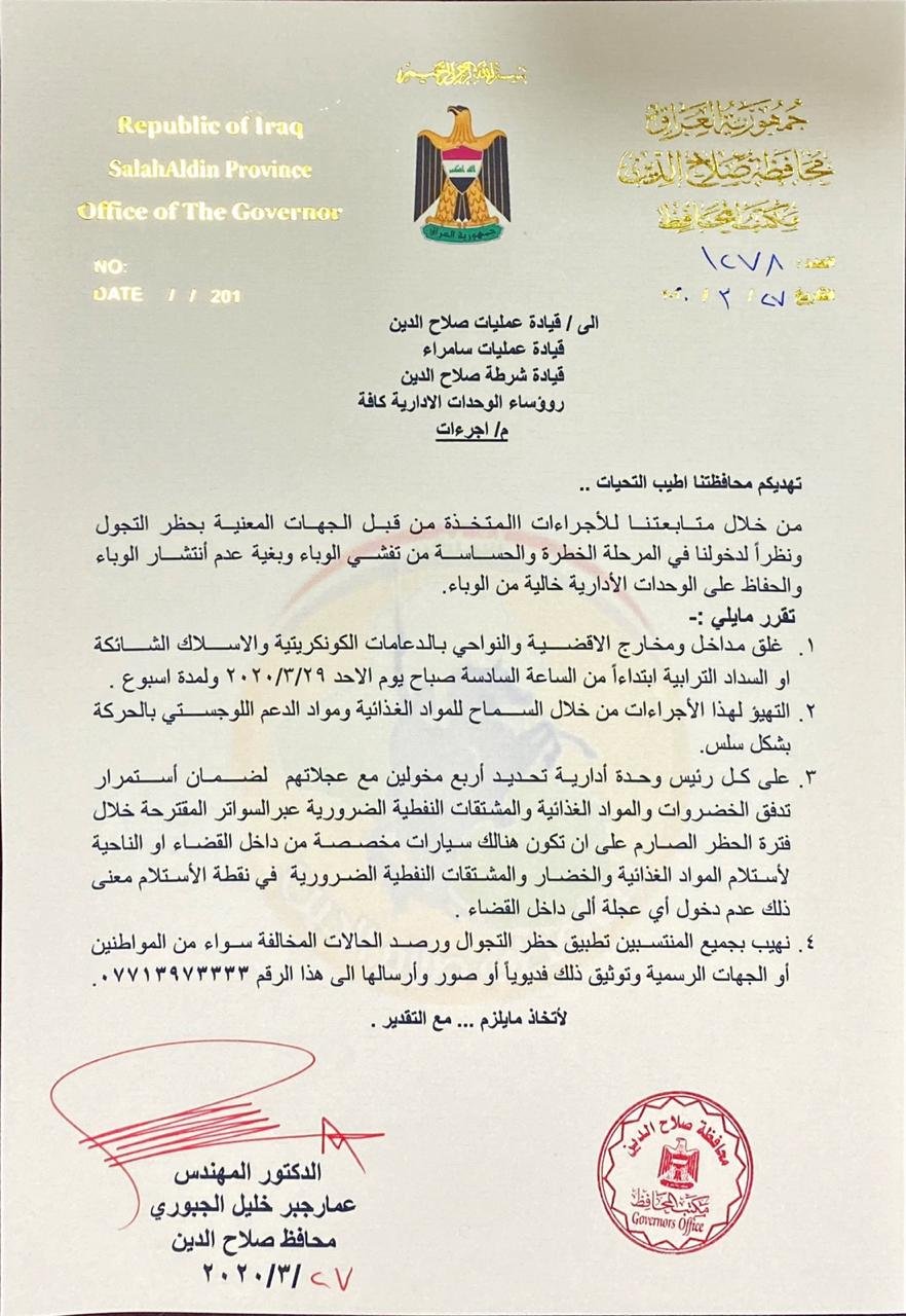 بالوثيقة.. خلية الأزمة في صلاح الدين تصدر أربعة قرارات لاحتواء كورونا