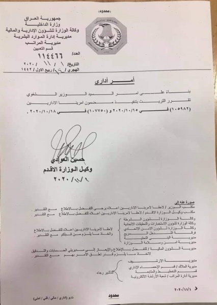 نشر مكتب وكيل وزارة الداخلية للشؤون الادارية والمالية، اليوم الاحد، كتاباً ينص على قرار وزاري بالتريث بالغاء اوامر تعيين.