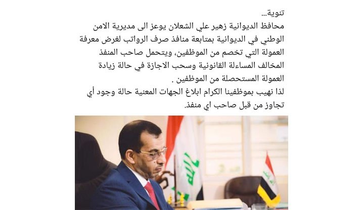 الديوانية تحذر منافذ الكي والماستر كارد من استقطاع عمولات تتجاوز الحد المسموح
