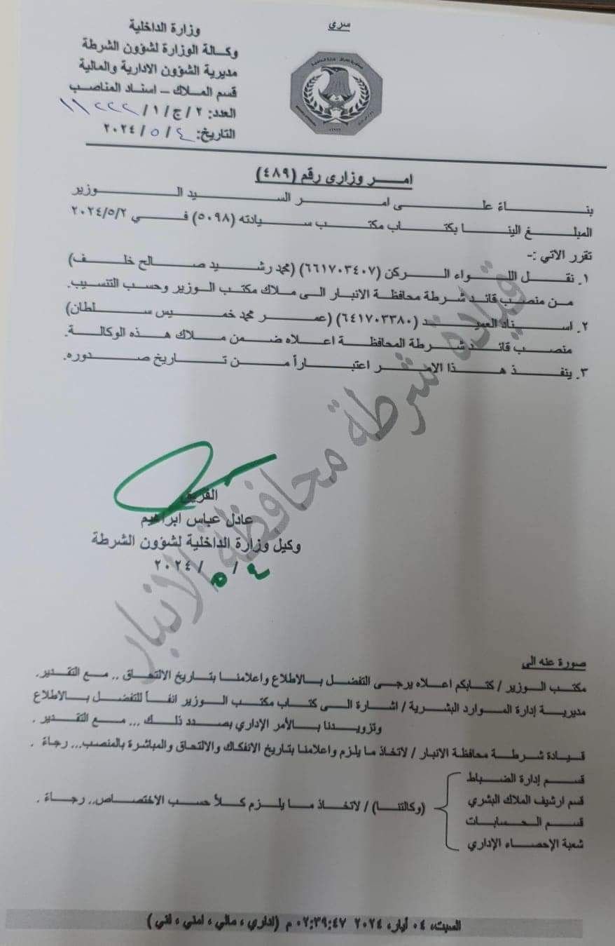 وزير الداخلية ينقل قائد شرطة الأنبار ويسمّي بديلًا له