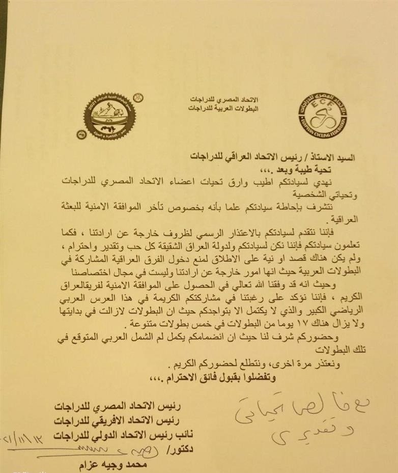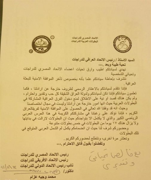 قدم الاتحاد المصري، اليوم الأحد، رسالة اعتذار رسمي من قبل الاتحاد المصري ورئيسة وجيه عزام الى الاتحاد العراقي للدراجات.